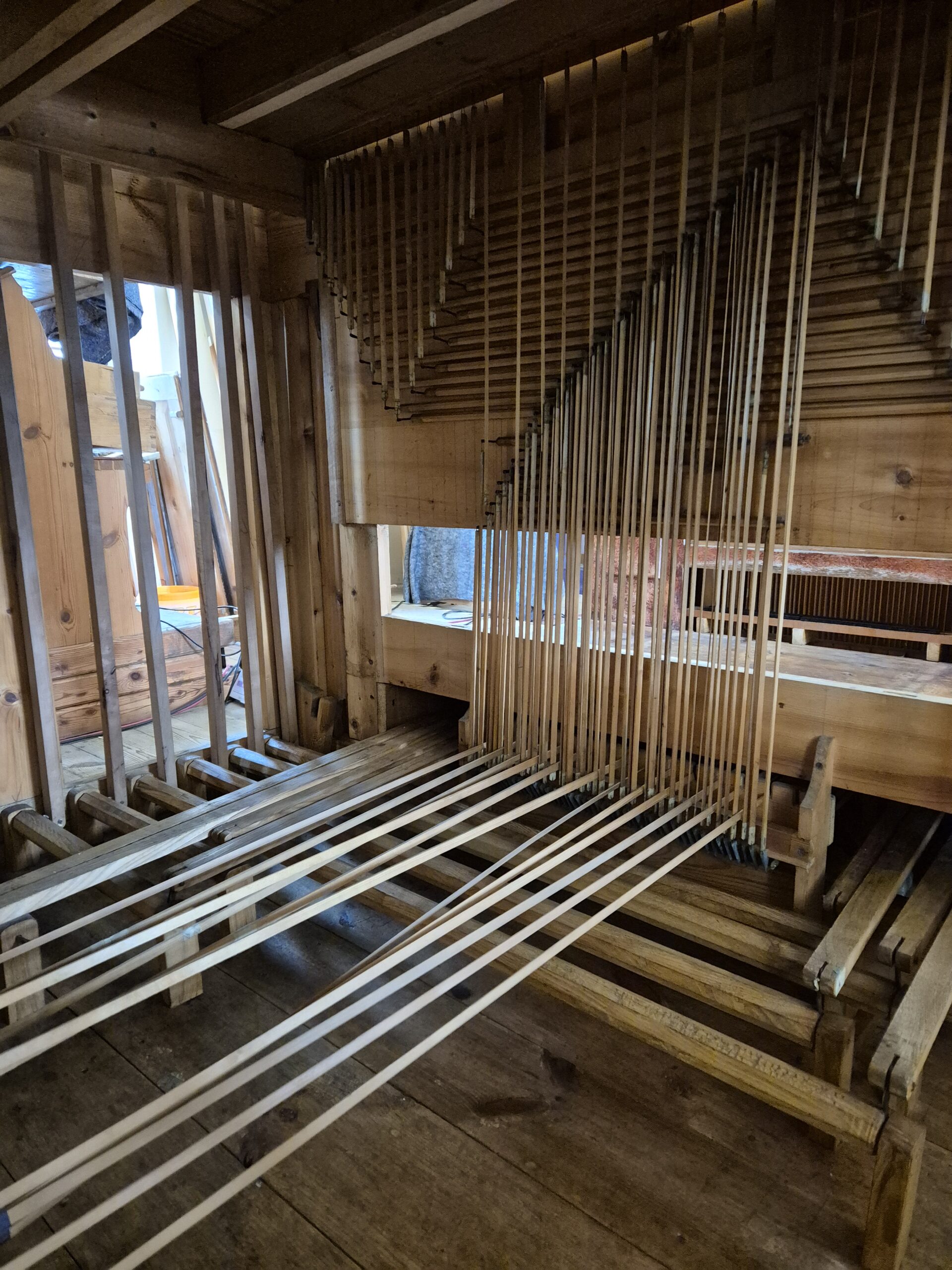 Anfang Dezember 2024 holte Hr. Wagner von der Fa. Klais den Blasbalg ab. Der Blasbalg wird in der Werkstatt in Bonn generalsaniert, ebenso ein kleiner Teil der Orgelpfeifen neu gemacht. Ein Ersatzbalg wurde wieder in die Turmkammer gestellt. Die Orgel bleibt bis Ostern bespielbar. Um Ostern bekommen wir die Ersatzorgel aus Zlan. Dann beginnen auch die Arbeiten vor Ort. Wie sie sehen, es tut sich was. Es wird spannend.